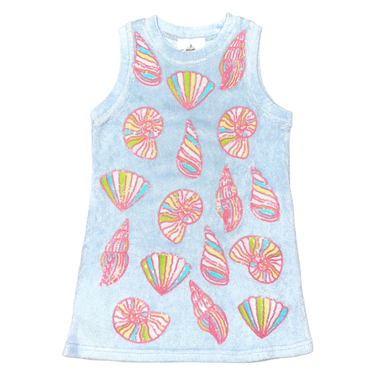 Baby blue terry cloth with sequined shells in multi colors.